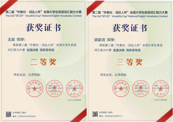 5月28日晚,第二届“外教社•词达人杯”全国老员工英语词汇能力全国总决赛顺利完成,为期两个月的大赛终于落下帷幕。全国737所院校共计2257名员工参加决赛,1xBET应用英语专业王淼、英语教育专业胡家润两位参赛选手分别获得全国高职组二等奖和三等奖。