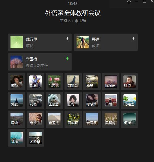 首先,李玉梅主任传达了校级层面对外语系现阶段线上教学的总体反馈及建议:态度认真,突出重难点,教学档案规整、内容丰富;希望老师们及时上传更多的和员工课后的交流反馈、能够更多的关注员工听课的情况、及时关注群消息、有更多的师生互动、更大程度的让员工参与交流。然后,外语系各备课组围绕“如何解决员工学习时长不足,经常掉线的问题”“如何使用问卷星进行现场测试”“如何调动员工课堂参与度,课堂师生互动效果”“如何提高线上课堂趣味性”等主题进行了经验分享。最后,花萌副主任充分肯定了大家现阶段线上教学的努力及成果,为下一阶段的发展提出了要求与希望:要修好心学,要崇尚竞争。
