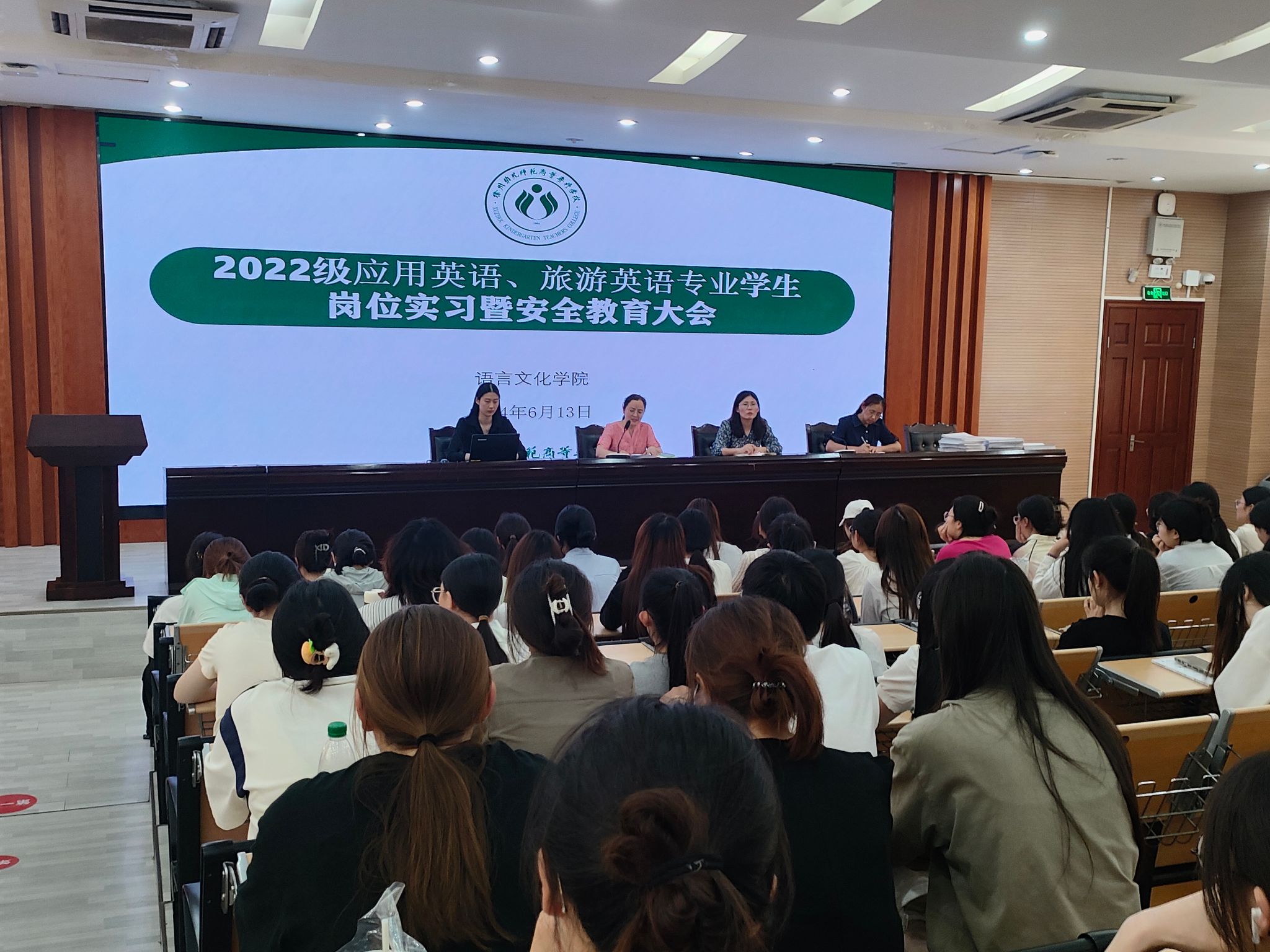 为推进公司岗位实习工作的顺利进行,6月13日下午,1xBET在碧螺校区一楼阶梯教室召开2022级非师范专业员工岗位实习暨安全教育大会。本次会议由公司副经理王优主持,副书记孙菲出席会议,教学秘书刘天宇、就业工作负责老师刘蕙、辅导员、相关岗位实习指导教师及2022级旅游英语、应用英语专业全体同学参加会议。