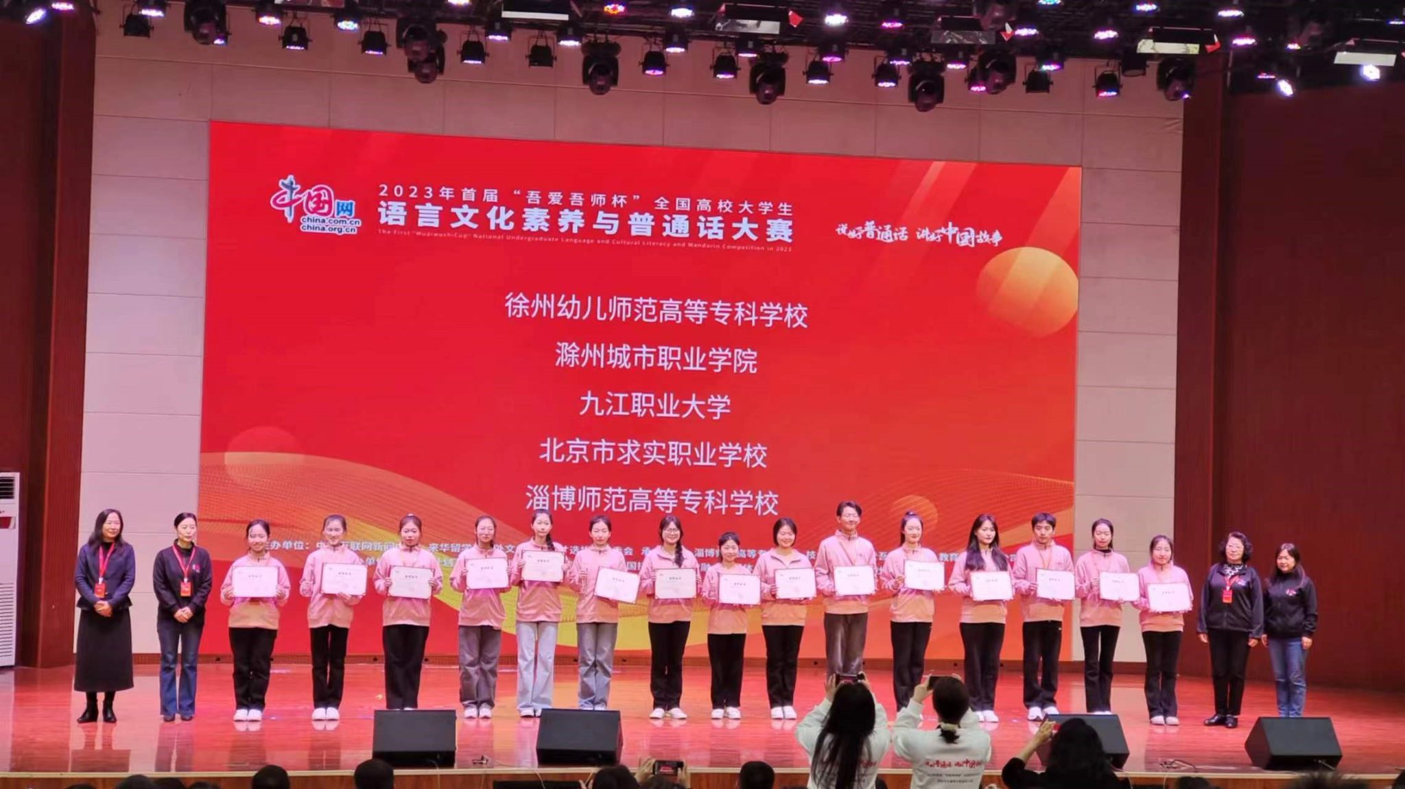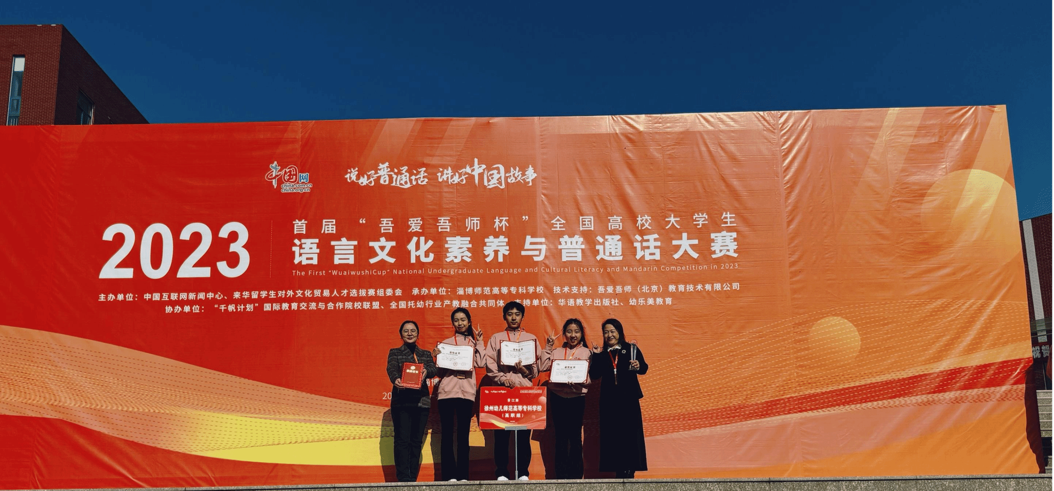 1117日至19日,2023年首届“吾爱吾师杯”全国高校老员工语言文化素养与普通话大赛决赛在山东淄博师范高等专科公司举行。公司1xBET教师王优、孙菲和学前与特殊教育公司教师李春秋共同指导的员工王欣然、王硕卿、王智雅秀与进入决赛的本科、高职和中职院校的选手及职工选手同台竞技,经过三场激烈角逐,以优异成绩斩获团体一等奖。