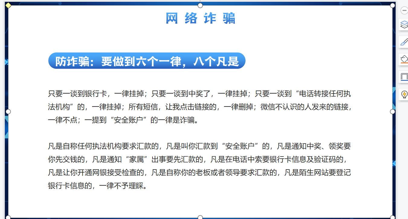 辅导员张潇雨老师在班会上,从电信诈骗、网络诈骗和街头诈骗三方面入手,详细讲解了三种诈骗的定义,诈骗手段以及预防诈骗的方法,并通过案例教学的方法,为同学们讲解被骗后果,引起同学们对于诈骗的警惕和重视。同时,张老师还为大家展示派出所精心制作的电信诈骗宣传单页,宣传石桥派出所沈警官的联系方式,告诫同学们一旦遇到疑似诈骗行为,第一时间寻求警官的帮助。