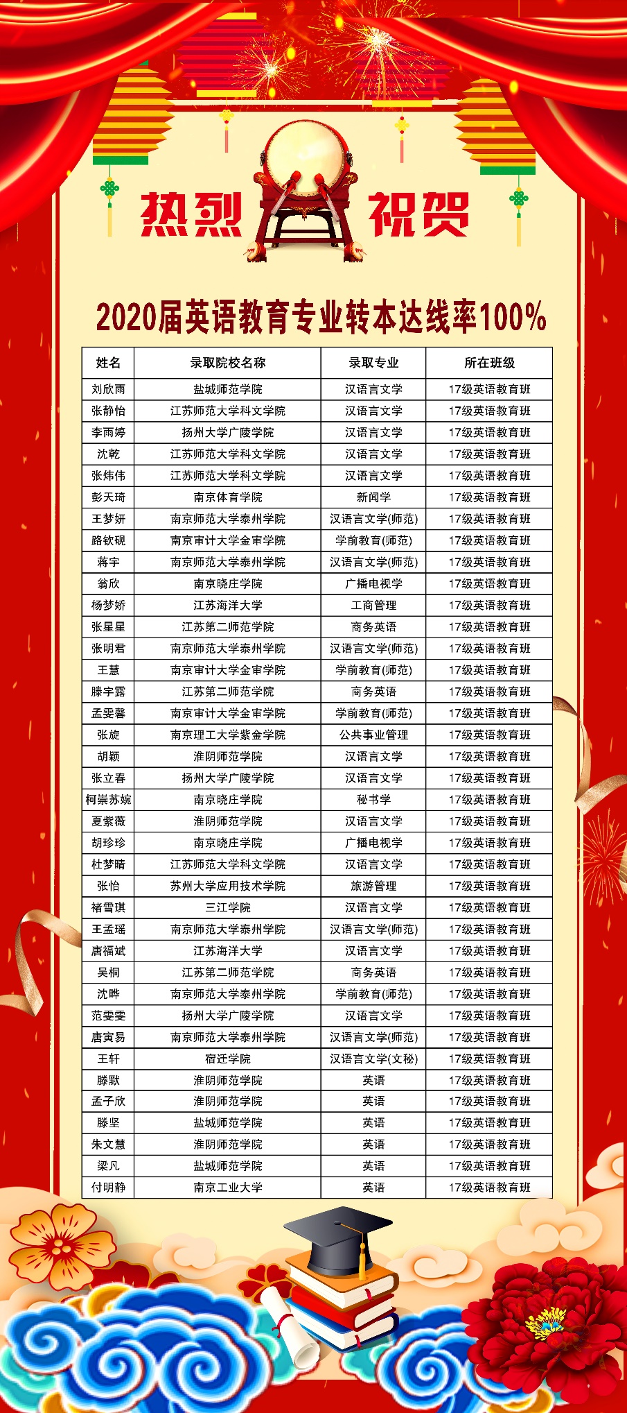 升学途径畅通,形式多样。员工可以通过“专转本”“专升本”“专接本”等多种途径进入本科院校深造,英语教育专业转本率在江苏省同类院校中位居前列。