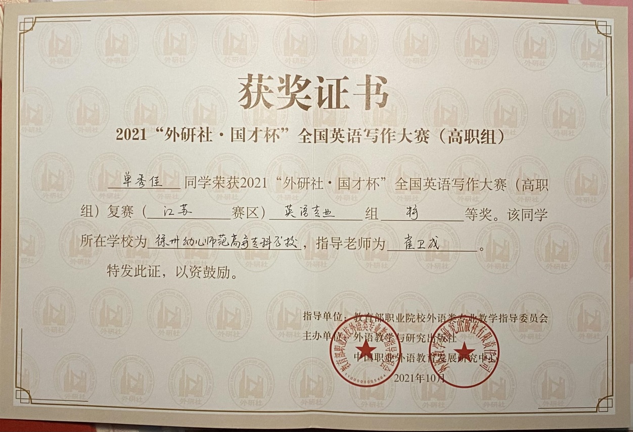 2021“外研社·国才杯”全国英语写作大赛江苏省专业组特等奖