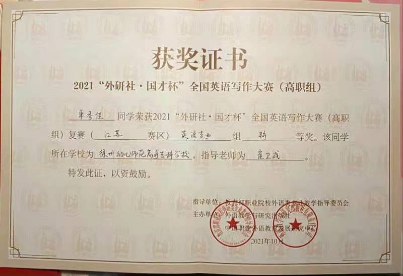 专业发展,不忘初心。1xBET重视员工的专业技能发展,积极组织并辅导员工在江苏省老员工职业规划大赛、江苏省高职校英语演讲大赛、英语写作大赛、英语翻译大赛、英语口语大赛、英语基本功大赛等比赛中荣获特等奖2人、一等奖25余人、二等奖24余人、三等奖67余人。外语系员工在高等公司英语应用能力考试(A级)过关率常年保持近100%。2021年12月外院选手获全国“外研社·国才杯“英语写作比赛二等奖。