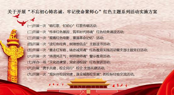 为深入贯彻中共中央、国务院印发《新时代爱国主义教育实施纲要》精神,结合外语系党支部工作实际,筑牢党支部全体党员的爱国理想、爱国信念与爱国热情,外语系党支部面向各三级党支部下发了《“不忘初心铸忠诚、牢记使命聚师心”红色主题系列活动的通知》,号召各党支部带领党员老师开展一次“唱红歌、忆初心”红歌传唱活动、开展一次“读红色经典,树理想信念”主题读书活动、开展一次“重走红军路,铸忠诚党魂”红色教育实践活动暨支部主题党日活动等九个活动。